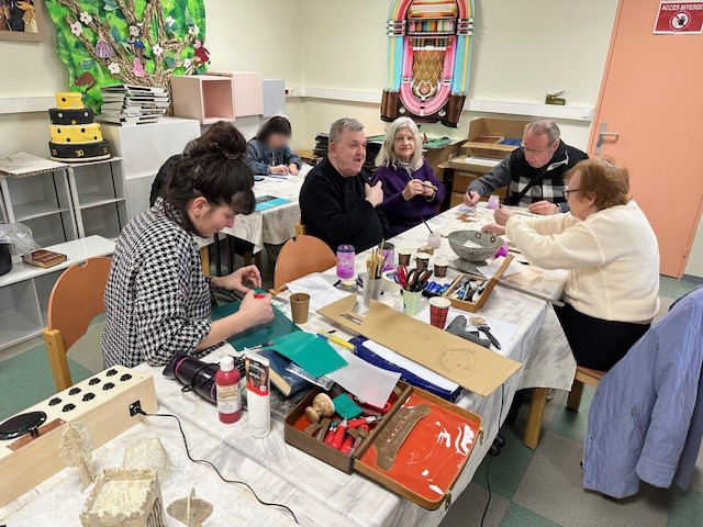 Les résidents ont participé à un projet, mené en partenariat avec la CALL, encadré par Perrine et Martin. Ensemble, ils ont réalisé une cartographie sensible de la ville de Noyelles-sous-Lens, mettant à l’honneur les résidents et leur quotidien. À travers les jeux de société, chacun a pu exprimer l’un de ses moments favoris de la journée à l’EHPAD. Avec du carton et du papier de livres recyclés, ils ont créé différents éléments symboliques : des cartes d’UNO, l’image d’un cheval pour représenter le jeu de Dada, ainsi que des dés. Chaque création reflétait un souvenir, un plaisir partagé ou un instant de convivialité.